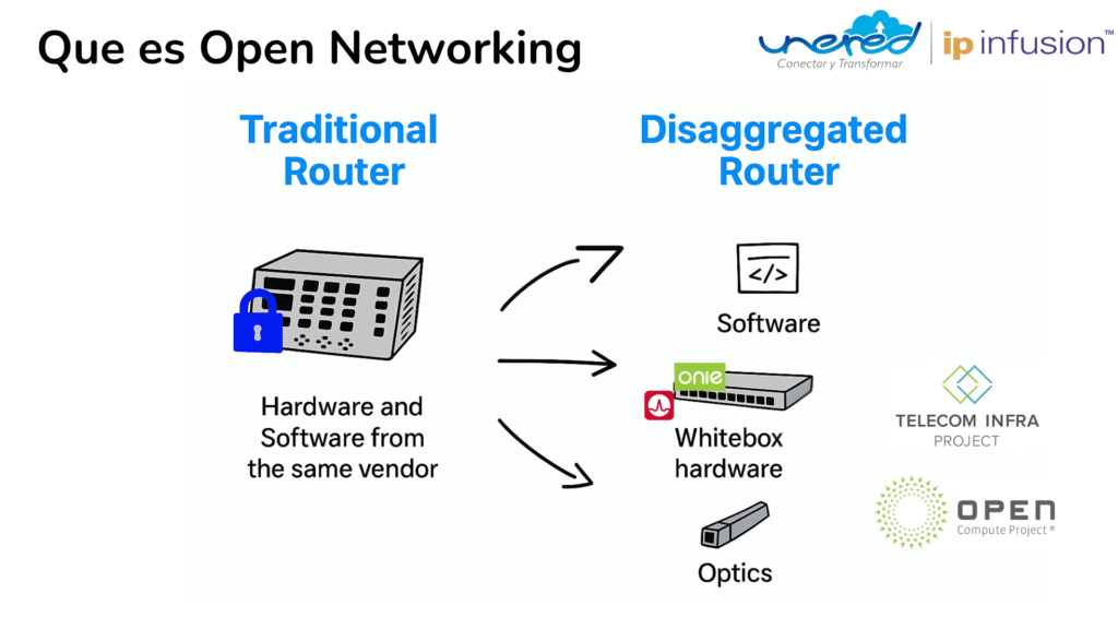 De ese impulso surgieron iniciativas como Open Compute Project (OCP), TIP (Telecom Infra Project) y sistemas operativos de red abiertos (NOS) por ejemplo como SONiC o IP Infusion OcNOS.
